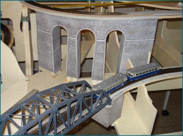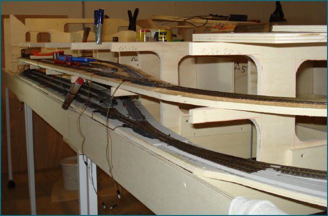 Der Unterbau auf dem die Spanten und Trassen aufgebaut werden, besteht aus einem Leistengitter aus 20mm Birkensperrholz. Diese werden millimetergenau zugeschnitten, verleimt und verschraubt. Einzelne Segmente werden untereinander mit 10mm Schrauben fixiert.